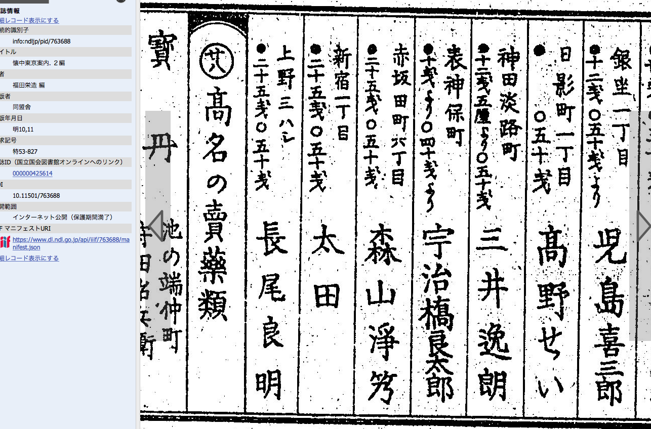 赤坂桐畑すなわち赤坂田町六丁目とある仮称森山写真館が乗っている明治十年の懐中東京案内![]() 号の淨タケカンムリに乃? ただし、タケカンムリに乃という漢字は無い 推測するに版木屋さんが 残念なことに明治十四年版にも継承されたうえに なんと! 改正東京案内 | ||||||