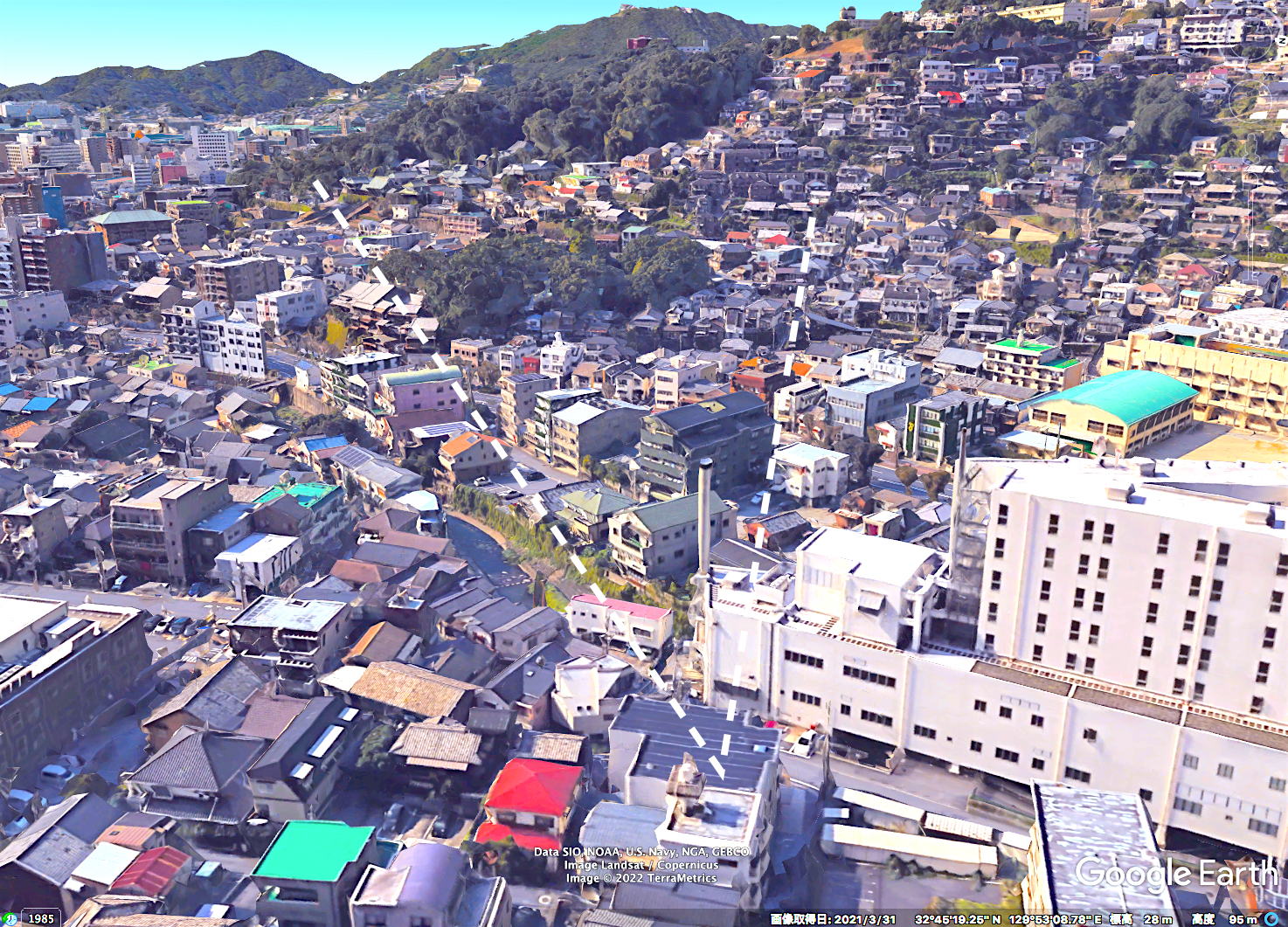 シミュレーションで用いたカメラレンズは、35mmフィルムカメラ用だと95mmにあたる 水平画角 21.5度。仮に、この写真のガラス原版が80ミリ50ミリだとすると、使用したレンズは焦点距離が211ミリのものとなる。それはそれとして、google earthが元気をくれる。