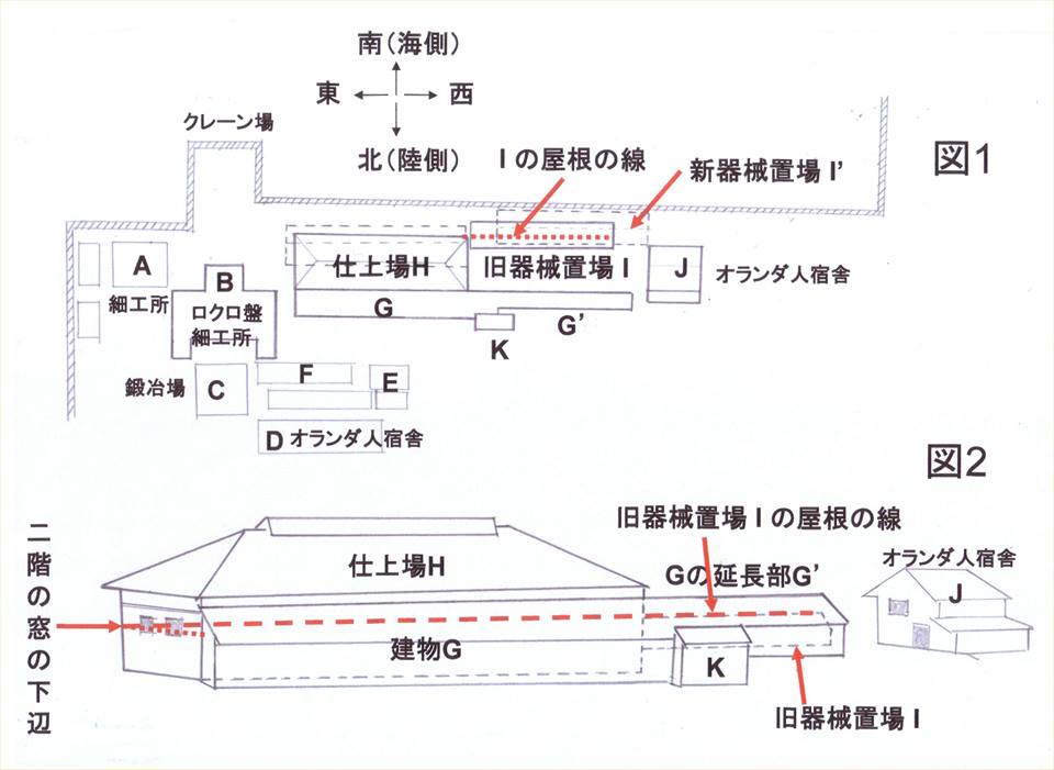 (イラストの青の長い建物=1階建ての「旧器械置場 I」の)先端部分は「仕上場H」の左の角にほぼ接して、高さは「仕上場H」(赤白の建物)の2階の窓の下縁に近い所にあります。