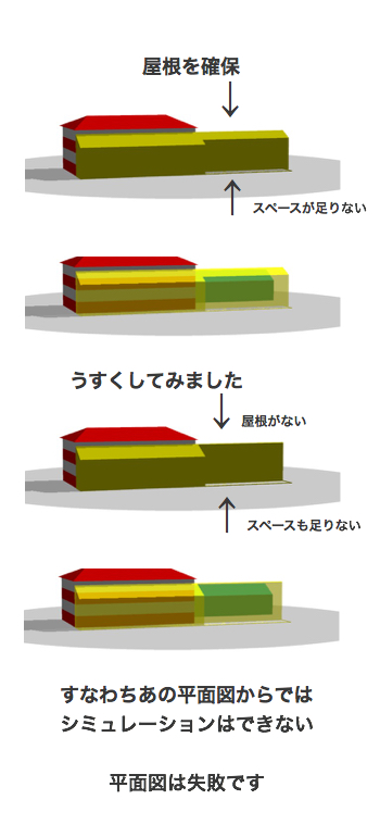 わざわざ、正面図と平面図をお書きになられ、この屋根の高さがココまでで、母屋の屋根の下にも届かない。だからどこから見てもあたしの考えでは隠居所は見えませんと仰るんです。