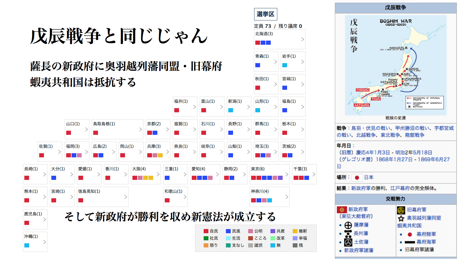 本来、政治も同じで国民の生活に多様性をもって巻き込まれていなければならないのだ。 こんかいの共産党民進党のとった行動は議員になりたい残りたいレベルの単なる就活だった。 よって、選挙戦にもなっておらず静かに静かに投票日が来た。