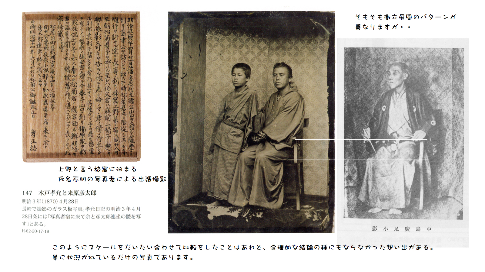 木戸写真の上野彦馬の撮影説よりずっと質が悪いのは、中島写真の上野彦馬撮影説だ。木戸と中島写真の状況は単に似ていると陳べる位が関の山で、長崎で・・上野彦馬で・・ああだこうだと陳べていくのは困りものだ。