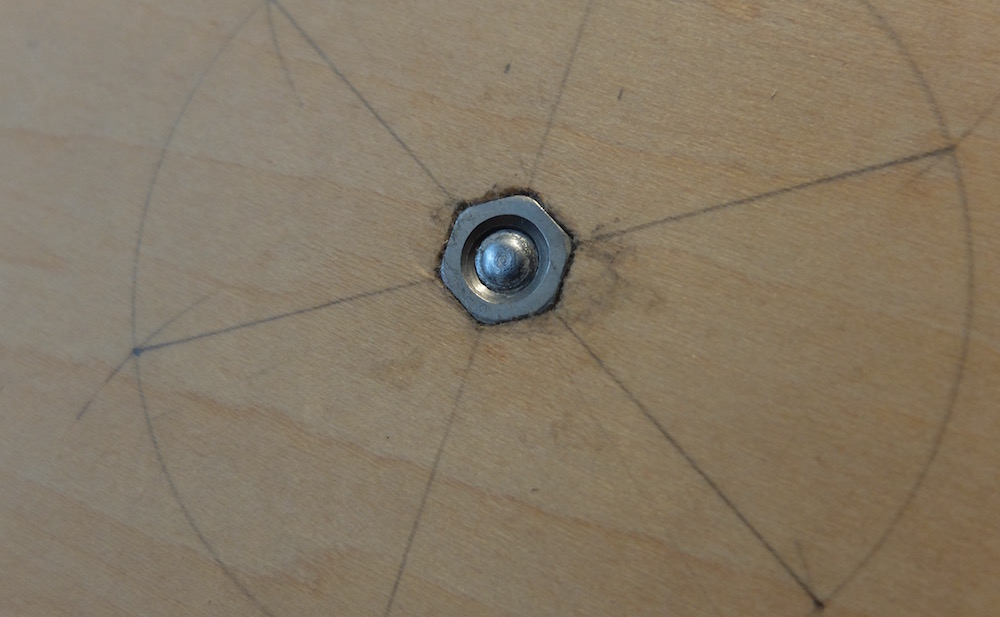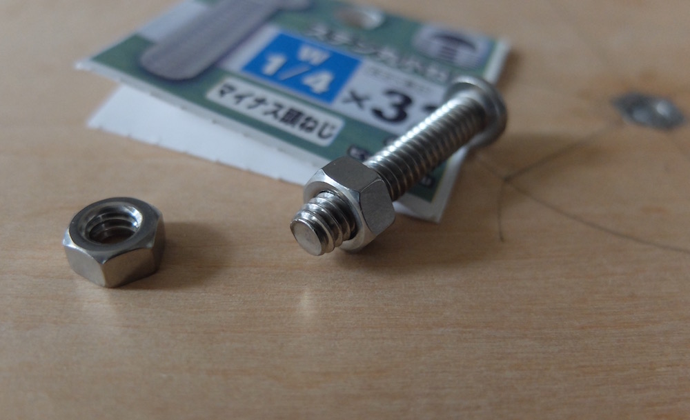 おしごとは、1/4インチ径のナットを、持ち合わせのベニヤの中央に、ピッタリしっかり埋め込み接着固定し、長辺一辺の二ヶ所にダボを打ち込んで完成。