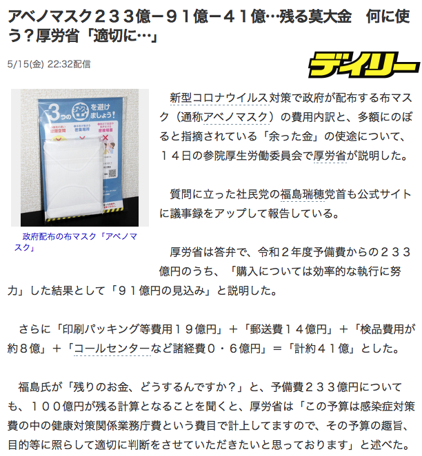 確認しますが、国会で取り上げられた「妊婦用」のマスク検品 47万枚だけの話で、全世帯用の話はまだですよ。