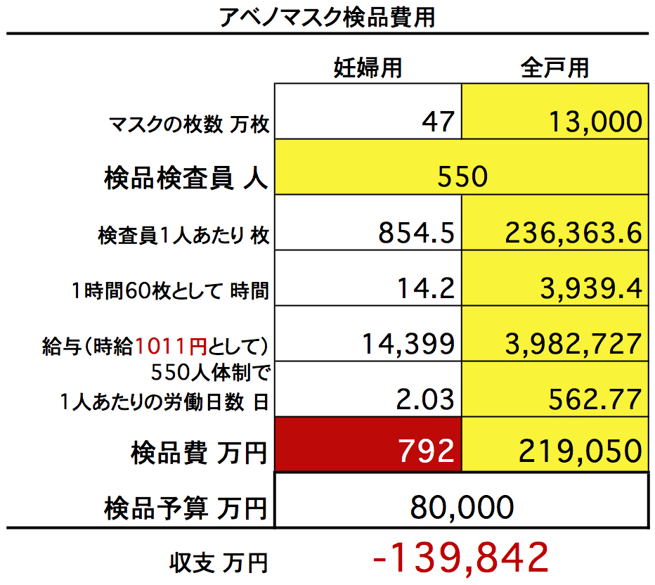 その数は、妊婦用のマスクの 277倍。 同じ手間がかかったとしたら、検品費用の総額は、22億近くなり、8億どころかさらに14億近くが必要になるのです。
