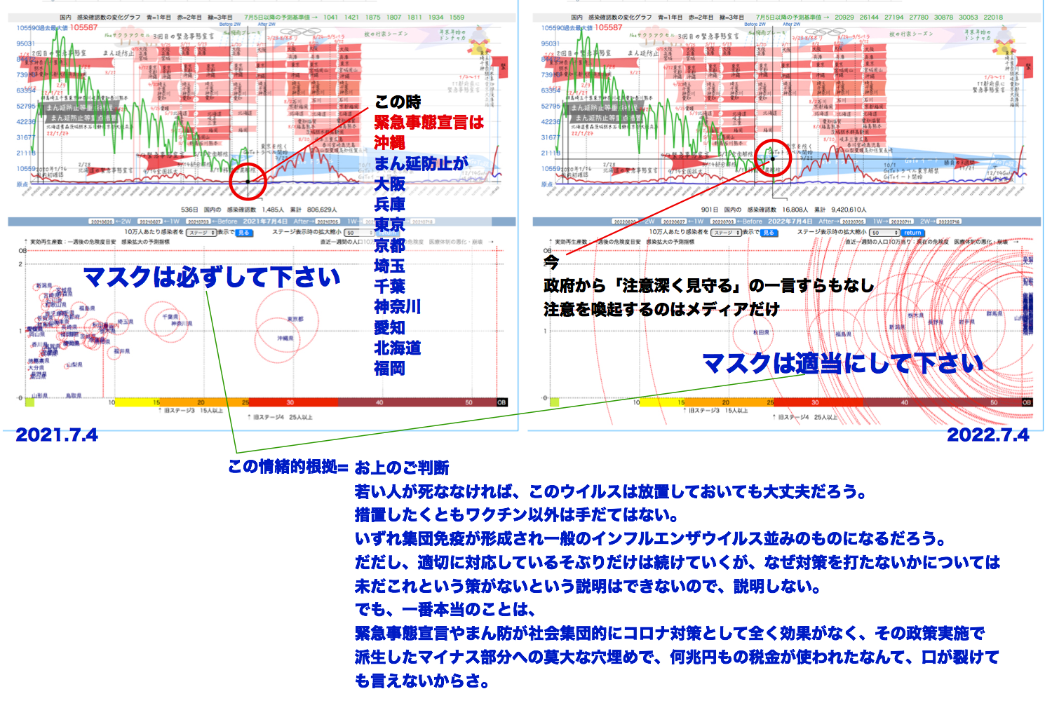 でも、一番本当のことは、緊急事態宣言やまん防が社会集団的にコロナ対策として全く効果がなく、その政策実施で派生したマイナス部分への莫大な穴埋めで、何兆円もの税金が使われたなんて、口が裂けても言えない。