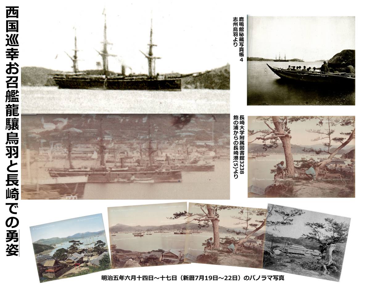 「長崎著御 十四日 拂暁二神島の南方に至りたまふ、波浪愈々高く、江島・大立島の間潮勢急なること箭の如し、福田沖に於て艦列を整へ、牛後四時長崎港口に進むや、砲臺及び露西亜国軍艦祝砲を発し、亜米刊加合衆国軍艦其の他碇泊の内外商船悉く飾旗の禮を行ふ、御艦楽を奏して此の間を徐行す、五時二十分入港し、鞄の浦と大浦との中間に投錨す、」