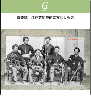 時期については、帯刀ザンギリ・・いずれも明治二年〜四年ごろの男たちの姿である。場所については、EよりはGの記述による芝神明宮の前にあった写場のものだろうが、Eに神田とあるかぎり、合理的に証明できるものを探し解明をしなければならない。