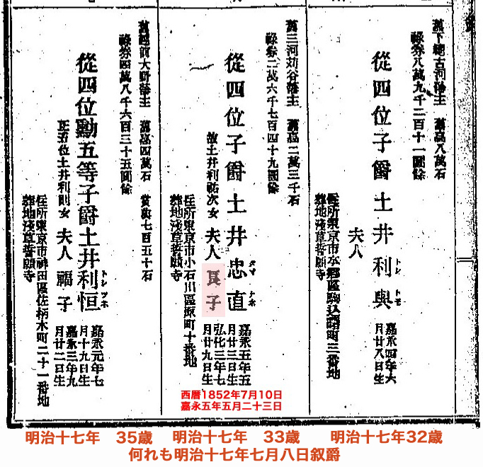 古河土井利與の子は 娘(大橋篤治室)、娘(井関保久室)、娘(金沢某室)、娘(高田政治室)、利孝、利正、利大(三男)。