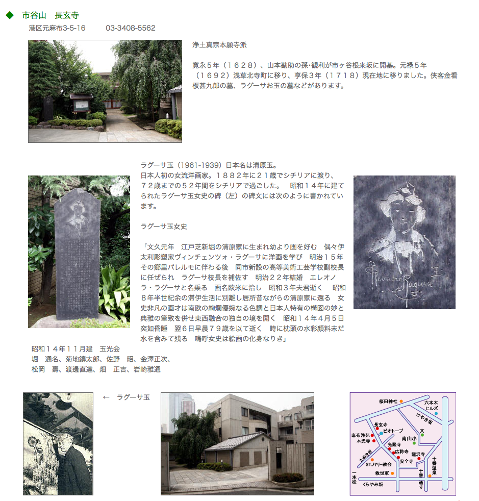 明治9年、工部大学校美術学校開校にあたり、日本教府により、イタリアから招へいされ、彫刻科を創設・指導にあたったラグーザ教授は、小山町(現三田1-11讃岐会館) の官舎に住んでいました。 翌10年、散歩の途中、美しい庭園にひかれて清原家に立ち寄り、絵を描くことの好きな少女を知りました。ときに玉16歳。ラグーザ36歳。ラグーザは玉の画才の非凡なのと、愛らしさに好意を持ち、西洋画の技法を教え、彫刻のモデルとするなど、交際するうち、ついに求婚。両親も誠実な披の人柄を見て結婚を許します。3年後のことでした。