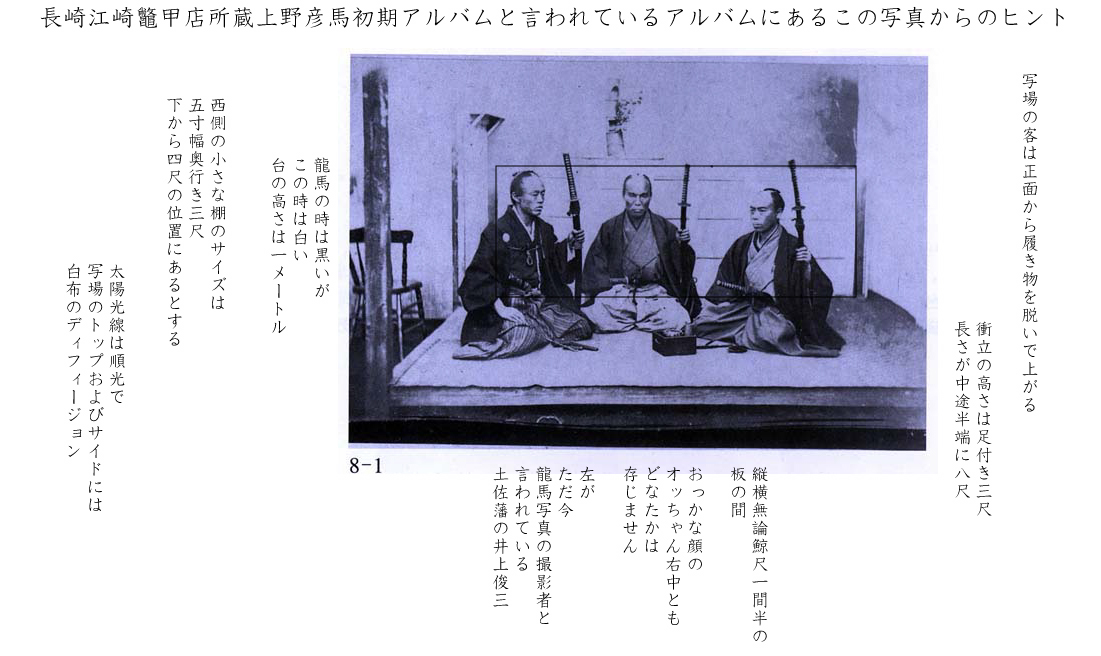 上野彦馬のちっぽけな梁の高さ九尺広さ四畳半の写場が、屋敷の何処に建っていたかは不明だが、例の△太陽光り漏れ3例により、余は北を背に南を向いて建っていることが合理的としている。