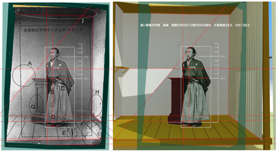 そんな要領で、彦馬写場のいろんな写真に写っている、壁・床・柱・床下・塀・大道具・小道具などを、一つ一つ比較検討し、それらの実際上のサイズを予測することから始めた。