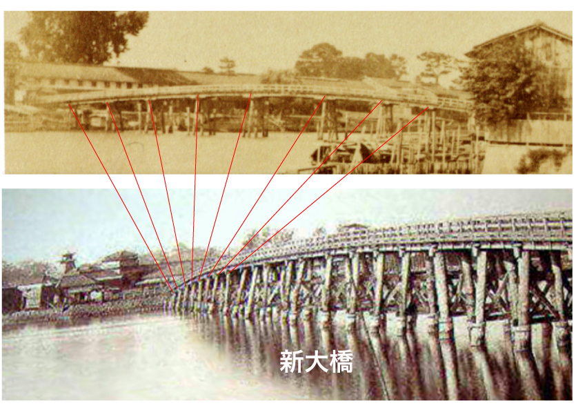 新大橋は、元禄六年創架当時長さ京間で100間、幅が3間7尺の大橋であった。
