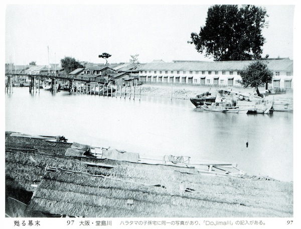 余は大阪の堂島の蔵屋敷のあたりがあやしいと睨んで、大阪の橋の写真を探し、ついに甦る幕末97の「DoJima川」写真に巡り会った。