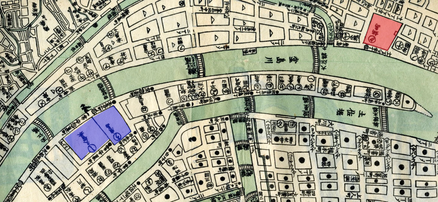 青でマークした広島藩と久留米藩蔵屋敷浮世絵