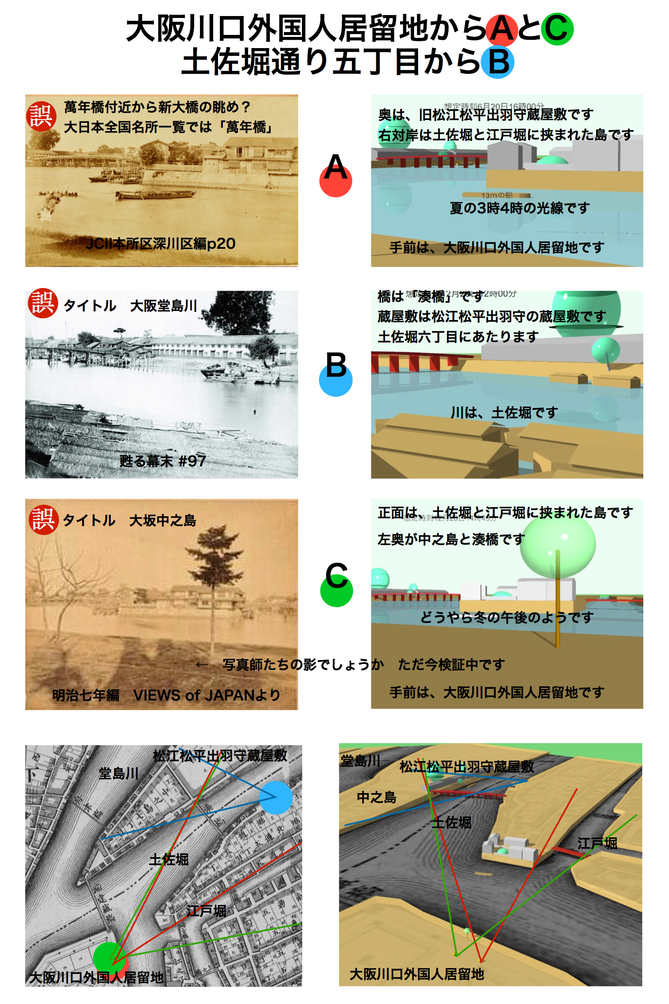 明治の大阪地図を広げて、写真Cにうつる三本の川に挟まれている地域と橋の条件を満たす場所を見つけて、検証をすれば良いだけだ。