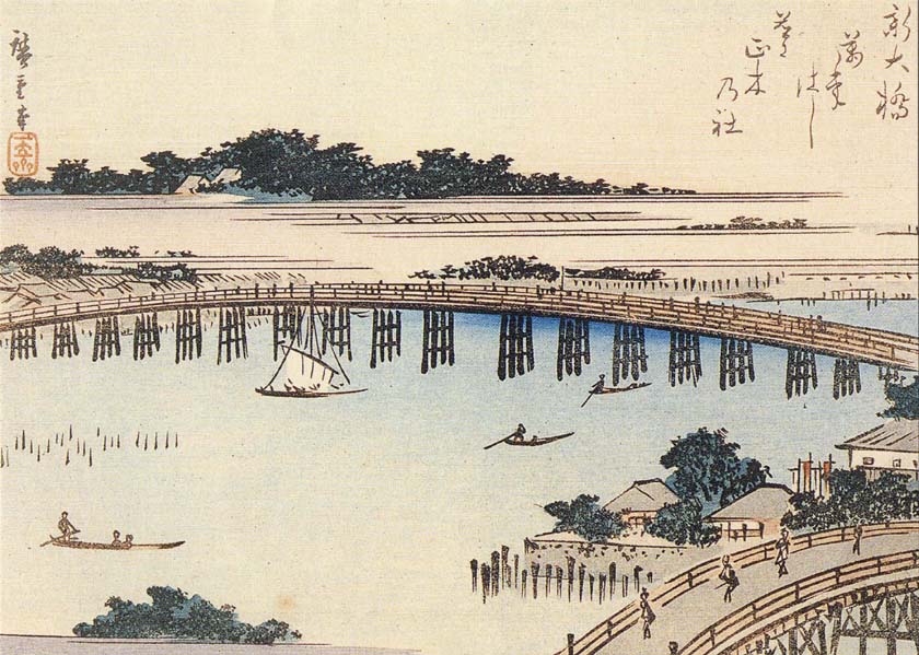 奥に見える橋の橋脚の数や、大型木造橋の平均橋脚間隔などを基に川幅を計算すると、80〜100m程の規模の川であることが想定できた。要するにこの川は、墨田川では絶対にあり得ないのだ。