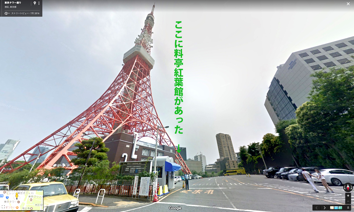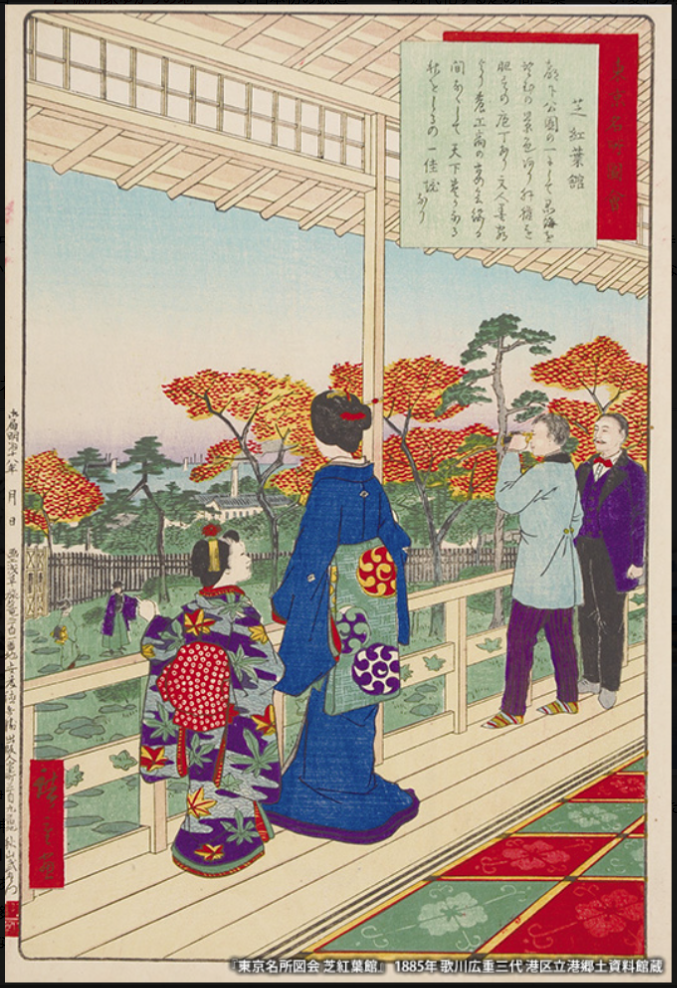 背景の建物フォルムや庭園の植栽の様子が、紅葉館の参考図とピッタリであることが確認できます。