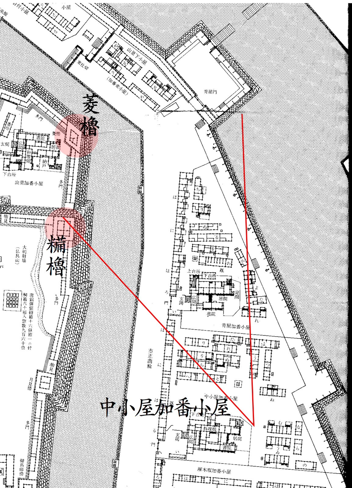 さて、今回たまま偶然とはいえ、中小屋加番小屋の大名屋敷の建物影も、奥の建物の陽当たり具合も写真の条件にピッタリと合うのだ。
