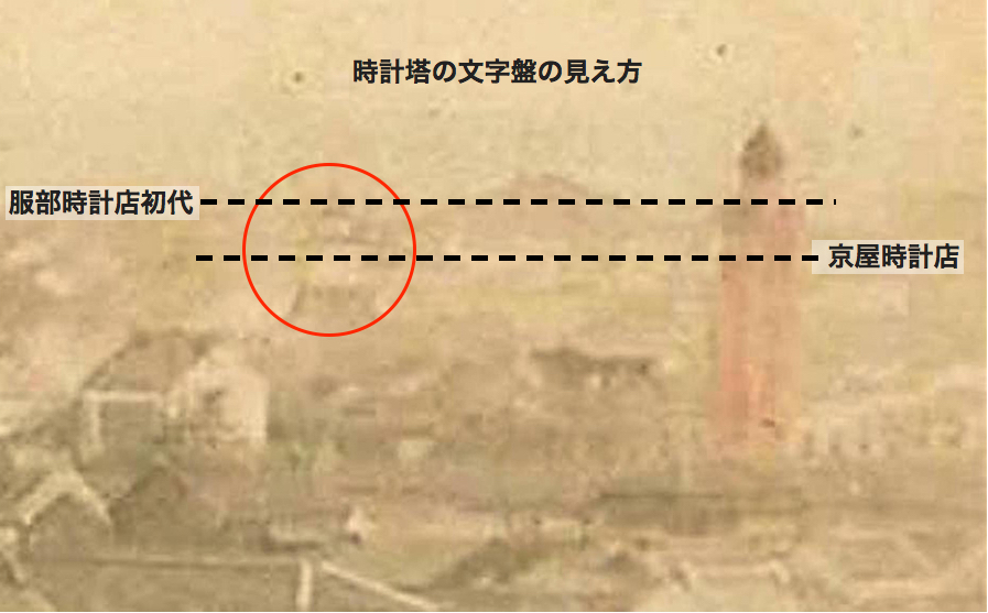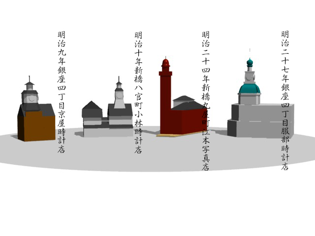 明治二十七年以後の設定では、同じ銀座四丁目にある、京屋時計店銀座支店と服部時計店の二つの時計塔は、やや重なって見える。