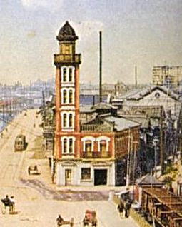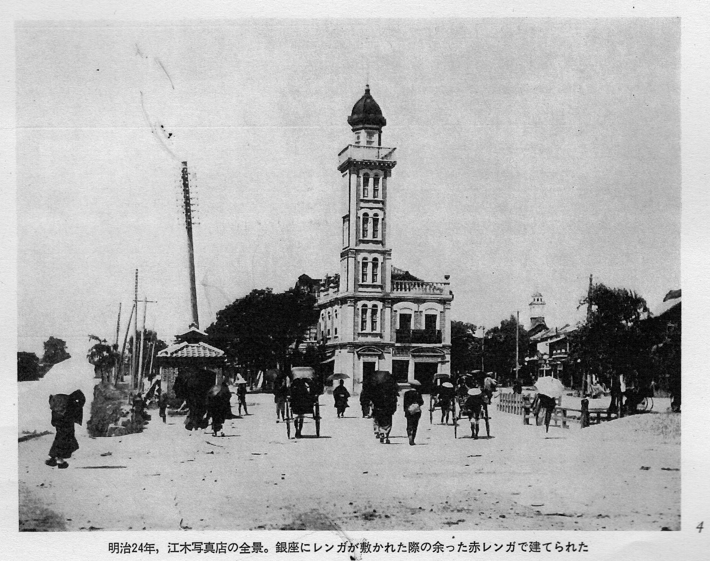上右の写真は、赤く色付けされた塔、すなわち、明治二十四年末に竣工した新橋丸屋町三番地の江木写真店の六層の高塔である。