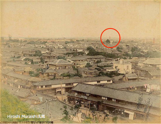 愛宕山山頂からの古写真で、上手に赤く着色された建造物は、京橋区丸尾町の江木写真店の名物タワーであることはすでに判明したが、中央の赤着色の煙突状のものは何なの?という疑問は残っていた。