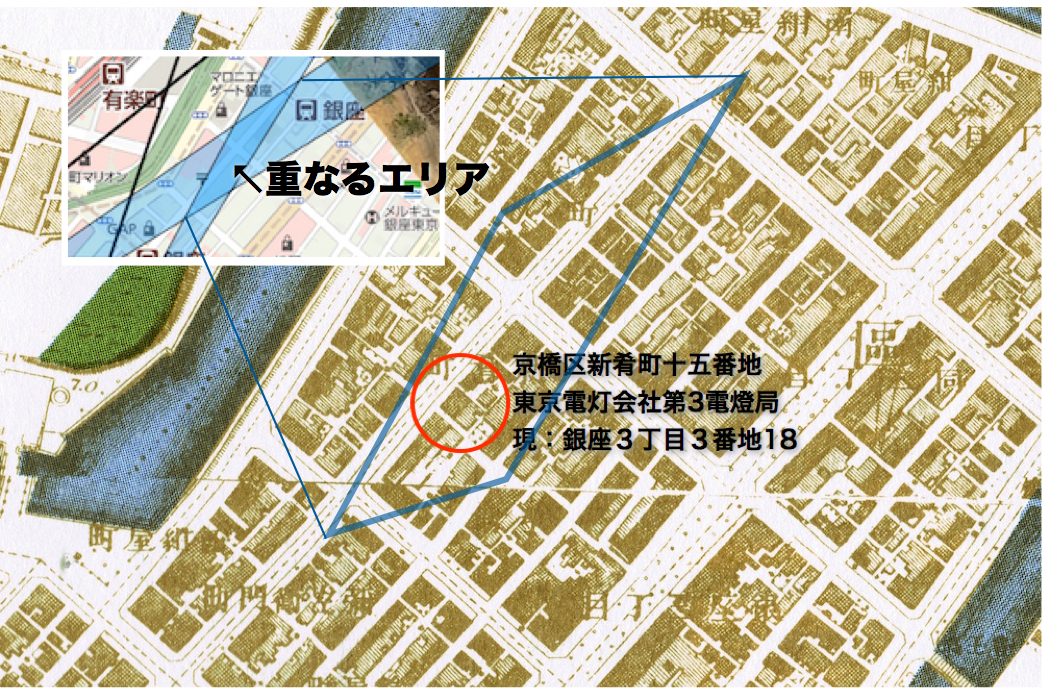 再び地図上で、新橋から銀座七丁目六丁目方向に線を引き、愛宕山から引いた線の交点を求めた。