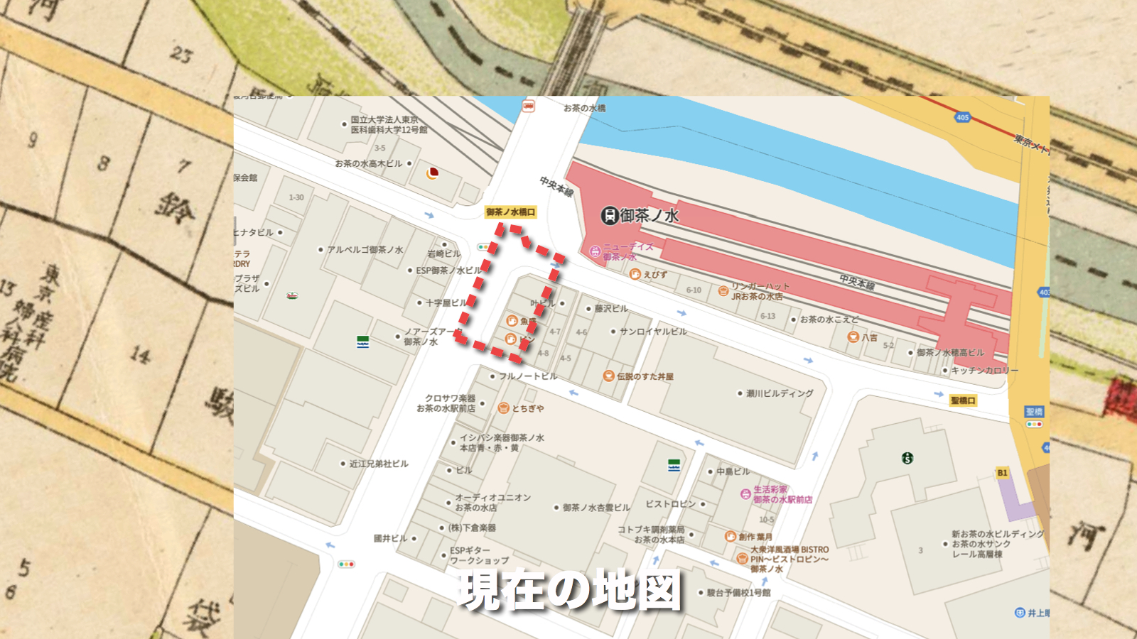 JR御茶ノ水駅前広場から駿河台下に向かう明大通りの左半分と隣接する歩道と5・6軒の小さなビルを含む三百坪ほどの長方形のエリアがそれだ。