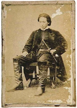 第一次長州戦争をひかえて、大坂で写した。陣羽織、鉢巻き姿で戦場へ。