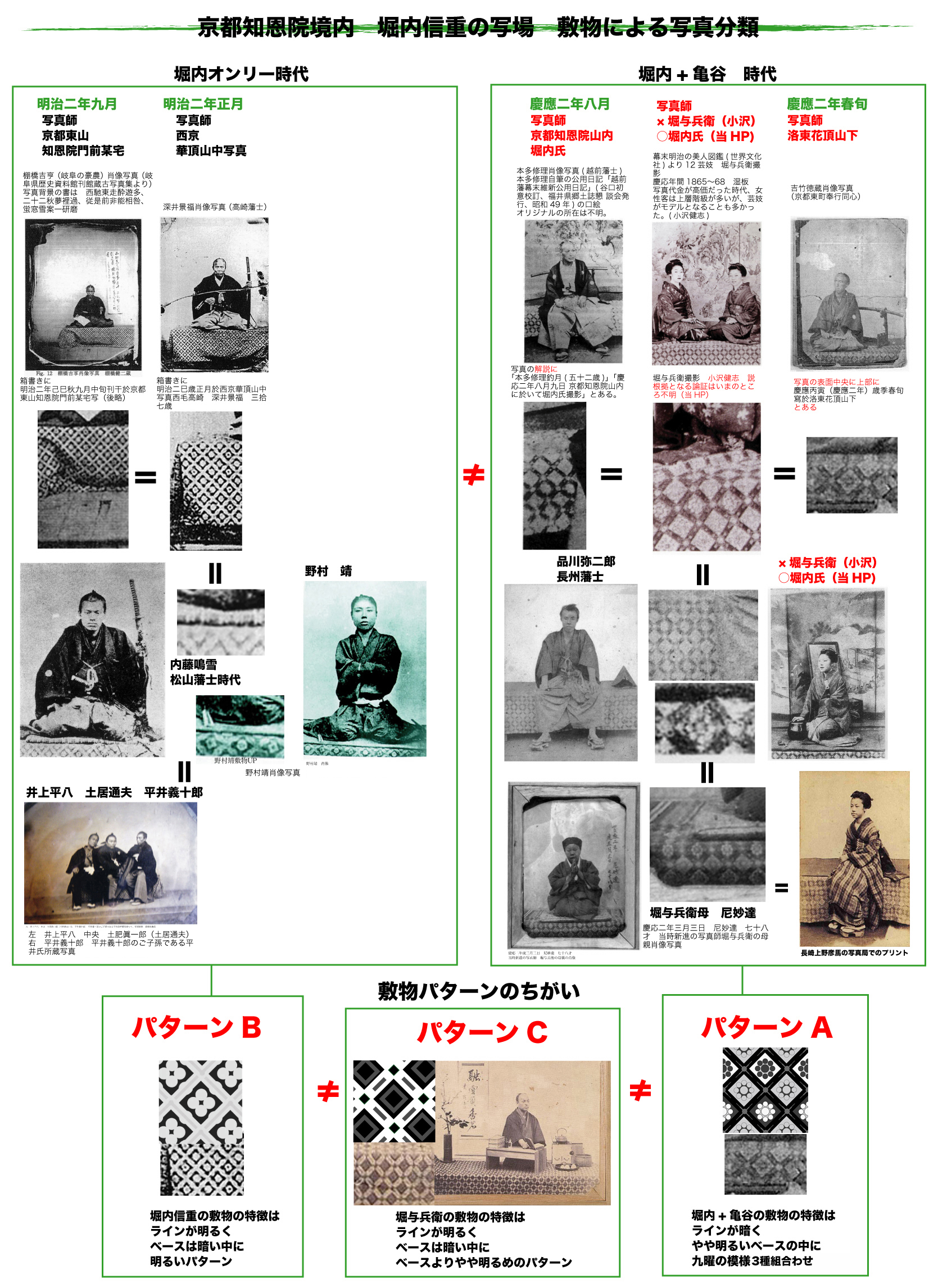 パターンAの敷物写真 京都知恩院山内に於いて堀内氏撮影 堀與兵衛撮影ただし小沢氏の書籍の中の記述 於洛東花華山頂山下 パターンBの敷物写真 於京都東山知恩院門前某宅写 於西京華頂山中写真 パターンAのうち、写真師堀與兵衛とされる二枚の写真は、そのグループ内の写真と同じ敷物で、さらに同じ屏風バックの写真もある。しかしながら撮影場所は、知恩院の堀内と祇園の堀と異なっている。 堀與兵衛撮影とされているのは大権威の小沢健志先生である。当HPはこの写真の撮影者が堀与兵衛である根拠を未承知であるが、当然「京都知恩院山内に於いて堀内氏撮影」や「於洛東花華山頂山下」などの記録がある写真でも、大権威のお説に従えば、堀與兵衛の写真である可能性を考えねばならない。 しかしそれは極めて不自然だ。根拠の記録があるものが、全く根拠のない「お説」に道を譲ることになるからだ。 当HPでは以上の意見を申し上げた上で、あえて、この二種類の敷物写真は、華頂山の堀内の写場による写真と考える事を提案する。 同時に 仮説として 当HPは 敷物のパターンから 右のグループの写真は「亀谷+堀内」時代のもので、左のグループの写真は亀谷氏が去った後の「オンリー堀内時代」のものであろうと・・・考える。 当然、大権威小沢氏の説には根拠が示されていないことから、大権威が堀與兵衛とするこのシチュエーション写真が他にもあれば、当HPは、当面これら写真が、同一の敷物や同一の屏風であれば、堀内の写場の写真としたい。 また、古写真研究家のshige氏より内藤鳴雪(堀内オンリーパターン)および品川弥二郎と小沢大権威が堀与兵衛とする女性肖像写真(堀内+亀谷時代パターン)の写真が寄せられたのでチャートに加えた。感謝。 同時に、類似敷物の堀与兵衛の肖像写真が添付されていたので、3っのパターンの敷物の違いも図示した。 またまた 資料(尼妙達・与兵衛の母親肖像/野村肖像/土居通夫等肖像)をいただいた。 ありがとうございます。 こうして 資料の写真を並べて比較観察すると、大権威の「堀与兵衛説」の根拠をお教え戴く必要がますます高まるのである。 とは別に・・・機は熟したり。「長崎の人亀谷」と京都の写真師の関係についての「新説」を発表するチャンスがやってきた。乞うご期待であります。