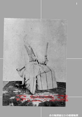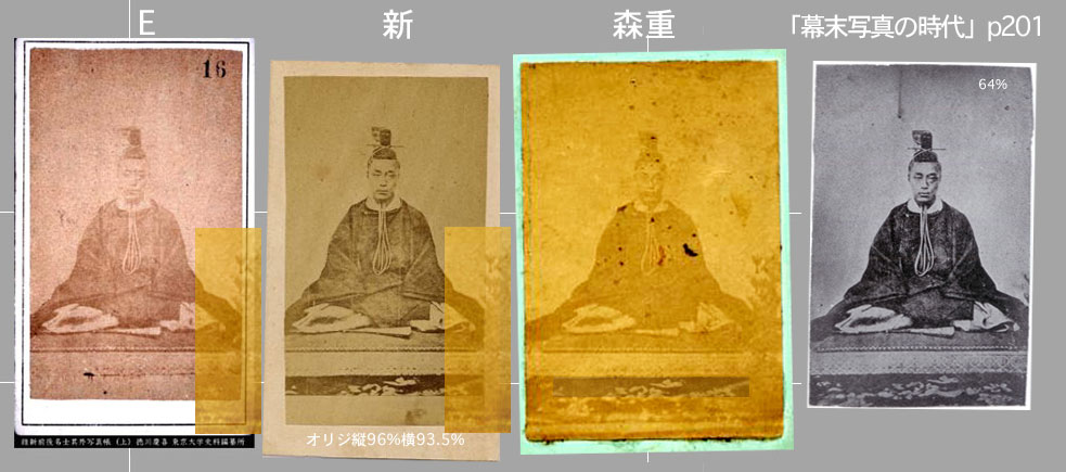 今までD系の写真には、小道具の刀掛けは無いと思っていたが、実は、刀掛けはあった。その証拠が森重さんが収集した写真に残っていた。右隅に、ABCで見られる刀掛けの丸みを持った台の足の一部が確認できる。 森重さんの収集した写真をのぞいて、D系写真は、画面から刀掛けを消去する修正を施したコピー原板からのプリント写真であった。 (D系) 衣冠徳川慶喜(刀掛け有り)森重所有 2番目の「新」、次の「森重」さんがオークションで落とした写真、さらに一番右の「幕末写真の時代p201」は、最近森重さんが刀掛けの存在を見つけた写真。これら4枚は全て、D系の写真。 Dタイプ系衣冠徳川慶喜(刀掛け有り)森重所有について (この写真は)ネットオークションで入手した(元は青木さんがどこからか入手したもの)。 徳川慶喜の写真は、他の写真と比較すると、どうも明治の後半くらいに複写されたもののように思えます。それでいて写真台紙は特定の写真館のものではなく、安っぽい感じもして、ブロマイド写真みたいです。 森重 |