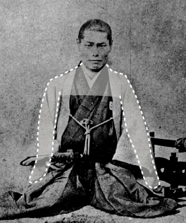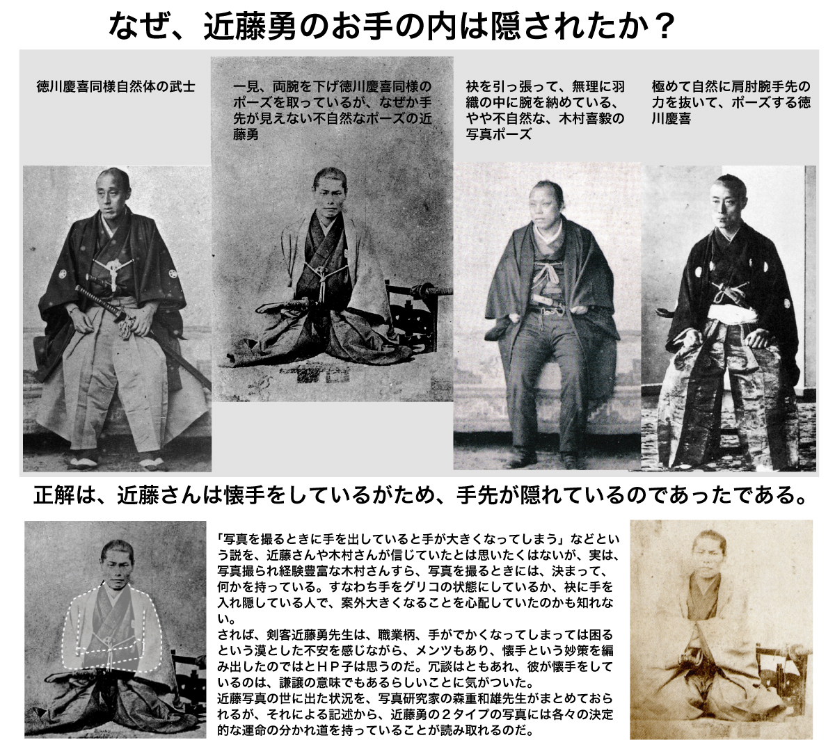 いきなりセンセーショナルな見出しで読者を引きつけようとする「東スポ」方式でごめんなさい。今回はそれほどのもんじゃありません。近藤さんのキャラクターを興味本位に若干プロファイリングしてみました。「東スポ」感覚でお願いいたします。 まず、懐手と判断をしたのは、 1.完璧に見えない両方の手先。 2.もし、手を縮めて袖内に格納しているとすれば、木村さんのように肘部分で袖奥に出っ張りができ、着物の肩から袖のラインが突っ張るはずであるが、それはない。 3.また、手の先を、そうまでして隠す理由は、手がでかくなるのがいや位の理由以外にはない。 4.近藤写真については、鳥羽伏見の戦いの前十二月十八日銃弾により右肩を負傷した後、江戸に帰り松本良順のもとで治療を受けた際、内田九一により撮影されたとされる説もあり、痛む右肩をかばって右腕を固定しているからなどと喜ぶ人も出よう。しかしもう一つの腕組みをしている写真は普通に腕組みをして、なお右腕を上にしていることから、手負い説を追求しても一貫しない。 5.左腕は着物の脇で腕を抜き、右前身頃の上に。右腕も右前身頃の上で、左右両腕は左前身頃の下に置かれている。