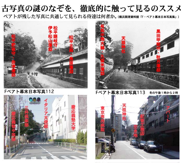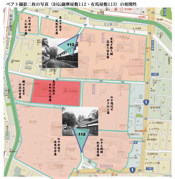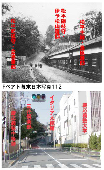 慶応3年(1867)の王政復古後、薩摩藩は徳川氏討伐の口実を設けるため、江戸市中を擾乱させていた。そこで幕府は、荘内、厩橋、松山、鯖江、上山の諸藩に命して、三田の薩摩屋敷を焼き打ちさせた。官軍はこれを口実に徳川氏討伐のための戊辰戦争を起こした。 ベアトは、混迷する政局を背景に勃発した大事件の現場を記録しようと、いさんで坂上の島津佐土原藩邸(現三井倶楽部跡)を目指した。しかし、坂下の警備役人の非常線に阻まれ、彼はその現場に立ち入ることが出来なかった。 この二枚の写真に写る武士たちの背後にあるのは、事件現場の島津佐土原藩邸である。 これらの写真に写る謎の侍達は、ベアトの行く手を阻んだ幕府の役人達であると考えると面白いではないか。今も昔も事件現場に民間は立ち入れないのである。 庵主は、二つのアングルの組み合わせによる二枚の写真は、数日前の事件の真相を追って果たせなかった、ベアトの苛立ちをも表した、歴史証言的な「一対の」事件現場記録写真であったのではないだろうかと想像する。 従って庵主は この写真の撮影日は、江戸薩摩藩邸襲撃から数日後、あるいは徳川幕府機能が完全に崩壊するまでの数週間のことであったと推測する。 残念ながら、マレーによる「112写真」の解説シートにある 事件の詳細な記述(下記資料参照)は、「113有馬様の屋敷」の解説シートのほうにはなく、江戸の大名の住まいや暮らしぶりが書かれている。 この「対写真」の語るべき、本来のメッセージを、別の意図の下に書き換えられてしまったことについて、ベアトがマレーに異論を唱えたかどうかは定かではない。