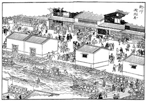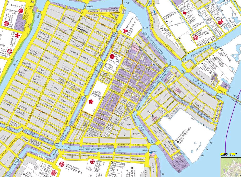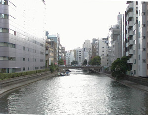 不明の写真の仮説 shige 2006-9-20 これが現在の「亀島橋」のたもと、辺りから「高橋」を望む方向の状況です。 橋の手前左側あたりは、江戸時代には町の名を「日比谷町」と称し、岸辺の荷揚げ場も「日比谷河岸」と呼ばれていました。 これは江戸時代初期、現在の日比谷公園あたりの住民が、徳川幕府の江戸城本格築城のあおりでこのあたりに移転してきていたためで、今は日比谷にちなむ地名は失われましたが、川岸の駐車場の奥に小さな「日比谷稲荷神社」が今もあります。 石黒敬章さん所蔵の「不明の運河」の古写真の場所は、ここではないだろうかと僕は推測しています。 亀島川が、日本橋からまっすぐ東に流れる日本橋川から茅場町の先で分岐・南下し、亀島橋付近で東に大きくカーブして隅田川に合流する水路です。 「不明の運河」の古写真の奥に見える橋は昔の「高橋」と見ました。 現在の「高橋」はその位置をだいぶ上流に架けてあります。 左の土地の名前、「霊岸島」はお寺の名が由来です。 肝心のそのお寺自体は明暦の大火後に深川に移転して、現在もそこにあります。 HPさんと行った深川資料館の左隣りのお寺です。 江戸時代は地盤のまだ緩い埋立地には、お寺や神社などをまず勧誘して、そこへ来る参詣客が踏み固めて地盤が締まってきたころあいをみはからって寺社を移転させ、別の(本来の)目的に土地(埋立地)を使うというのが、徳川幕府の都市開発のパターンだったようです。 霊岸島の場合、当時は港湾施設向きの理想的立地条件ですから、特にそうですね。 寛永11年(1635)には、松平越前守(福井藩主)が霊岸島に広大な敷地(お寺の南側)を拝領して下屋敷としました。 これに由来して、現在の亀島川は以後「越前堀」と呼ばれるようになっています。 しかし、「越前堀」は松平越前守屋敷周囲を直接めぐる堀の名、とする資料もあります。 また、亀島川の分岐点から隅田川に至るまでの日本橋川は「霊岸島新堀」(新堀川)と呼ばれていました。 亀島川が始まる場所には、今は巨大な「日本橋水門」があり、まるで関所のようになっています。 そこから10数mほど南にかかるのが今の「霊岸橋」ですが、江戸時代の「霊岸橋」はもう少し北、ほぼ水門のあたりにあったようです。 まぁ、「不明の運河」の古写真の場所は、この「霊岸橋」から西の亀島川の風景という可能性もあります。(仮説1) さて、今日も僕は会社(築地)から霊岸島、永代橋、門前仲町まで歩いて、それから地下鉄に乗って帰宅しました。 もう霊岸島地域はほぼ全ての道を歩きました。 幕末期、嘉永5年(1852)の番付『江戸前 大蒲焼』には、西の大関筆頭に「霊巌島 大黒屋」、関脇に「茅場町 岡本」という店の名が載っています。 明治期には橋のたもと富島町(現・新川)に、うなぎや「大國家」があり有名だったとあります。 「だいこくや」の漢字店名が異なるが読みから判断すると同じ店なのか、15代慶喜はこの店を指名したという逸話も伝わっています。 江戸前とは、「江戸湊」で獲れた天然ウナギを指しました。 実は霊岸橋の近くにある古いビルの一階に素敵なバーを見つけまして、今夜もここに立ち寄って一人で軽くハーパーをロックで軽く飲んでおりました。 霊岸橋 橋リスト バーを出て、霊岸橋を渡って永代橋に行こうと、ふと亀島川を眺めると、霊岸橋から亀島橋を望む亀島川の古写真ではないかと気がつきました。 というのも、この霊岸橋から新亀島橋にかけての右岸(亀島河岸)が、この古写真のようなS字カーブだったからです。(仮説2) 新亀島橋が初めて架けられたのは、明治15年(1882)3月ですから、当然、この古写真の奥に写っているのは亀島橋になります。 亀島川の霊岸橋から亀島橋までの現・茅場町側は、かっては亀島町だったので、この岸を亀島河岸と呼んでいました。 幕末時には与力の知行地からの穀米が組屋敷に近い、この河岸に荷揚げされたそうです。 ちなみに、同心の30俵の俸禄は浅草御蔵前の蔵米とのことです。 亀島川の現・新川側の河岸(写真左岸)には、霊岸橋から下流(写真奥)に向って、石河岸、越前堀河岸、解屋(とくや)河岸、将監河岸とつづき、大川(隅田川)、「江戸湊」に出ます。 同じ新川(現在は埋め立てられて存在しません)の一の橋から二の橋、三の橋にかけても、この古写真の風景によく似ていますが、「新川の今昔」という本を購入して、明治時代の写真などを見てみますと、新川の曲がり具合はこの古写真に似てますが、左岸には酒倉が並んでいて、違うようです。 ということで怪我の功名で、いま僕はこの古写真は、霊岸橋から亀島橋を望む亀島川の古写真だと考えています。 霊岸橋の近くの素敵なバーについてはまたいずれメールします。 不明の写真の仮説の続きです |