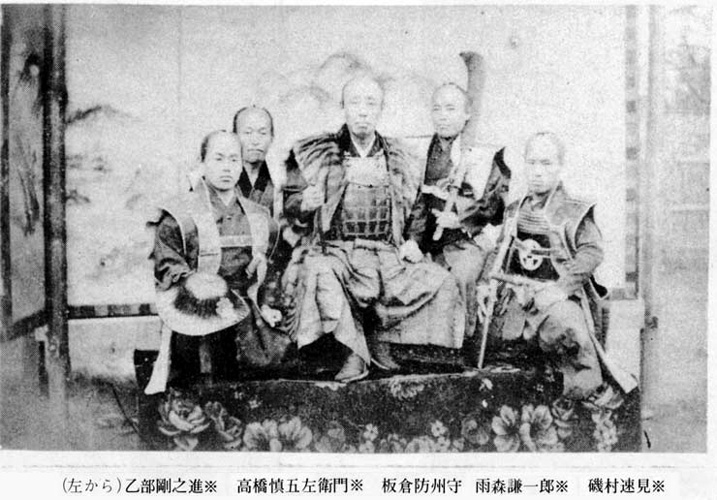 左の二枚の板倉勝静写真の絨毯模様は一致する (左)白虎記念会館蔵(板倉勝静の集合写真) (中)板倉勝静肖像(国会図書館蔵「珍らしい写真」よりコピー) (白虎記念会館蔵)板倉勝静の集合写真に写っている人物について 調べてみました。(shige 2003/11/12) 左より 武部銀二郎(たけべ ぎんじろう) 箱館新選組嚮導役、本名「乙部剛之進」 元備中松山藩士で、板倉勝静とともに会津から仙台に入る。 戊辰戦争の際、日光山に謹慎していた藩主板倉勝静が、 降伏のため宇都宮藩に自首した折、同行した8名の家臣のうちの一人。 その後、新選組に入隊をし、蝦夷渡航後、番兵取締の任に就く。 5月11日の箱館総攻撃の時、弁天台場で討死した。 高橋慎五左衛門 備中松山藩士で、文久3年禄高取調帳に、取次格御近習70石として名が見える。 いたくらかつきよ 板倉勝静 (1823〜1889) 備中松山藩第7代藩主。幕末の老中。桑名藩主松平定永の第8子。奥州白河城で生まれる。 1842年(天保13)備中松山藩主板倉勝職の養嗣子となり、 1849年(嘉永2)襲封。陽明学者山田方谷に出会い、 元締役兼吟味役としてその才を用いる。安政の大獄で寛典を主張したため大老井伊直弼により奏者番兼寺社奉行を罷免された。 1862年(文久2)老中となり幕政を担当。内外問題を抱え、幕議との意見の対立をみて辞職を請う。 1864年(元治元)罷免されたが、同年長州征伐で凱旋し、翌年再び老中に復す。 将軍徳川慶喜の信任厚く、慶応の幕政改革にあたってはよく補佐し、大政奉還にあたっては 不満ながらも実現に種々努力した。鳥羽・伏見の戦後、隠居。その後奥州に流転し参謀となるが(戊辰戦争)、 戦況は不利。函館に逃げたが、のち新政府に自首した。特旨をもって禁固を許された勝静は、 1877年(明治10)上野東照宮祠官となった。 雨森謙一郎 備中松山藩士で、明治4年華士族卒禄高取調帳に、元高90石として 「雨森健一郎」の名が見られるが、同一人物かどうかは不明。 磯村速水 備中松山藩士で、明治4年華士族卒禄高取調帳に、元高80石として 名が見える。 |