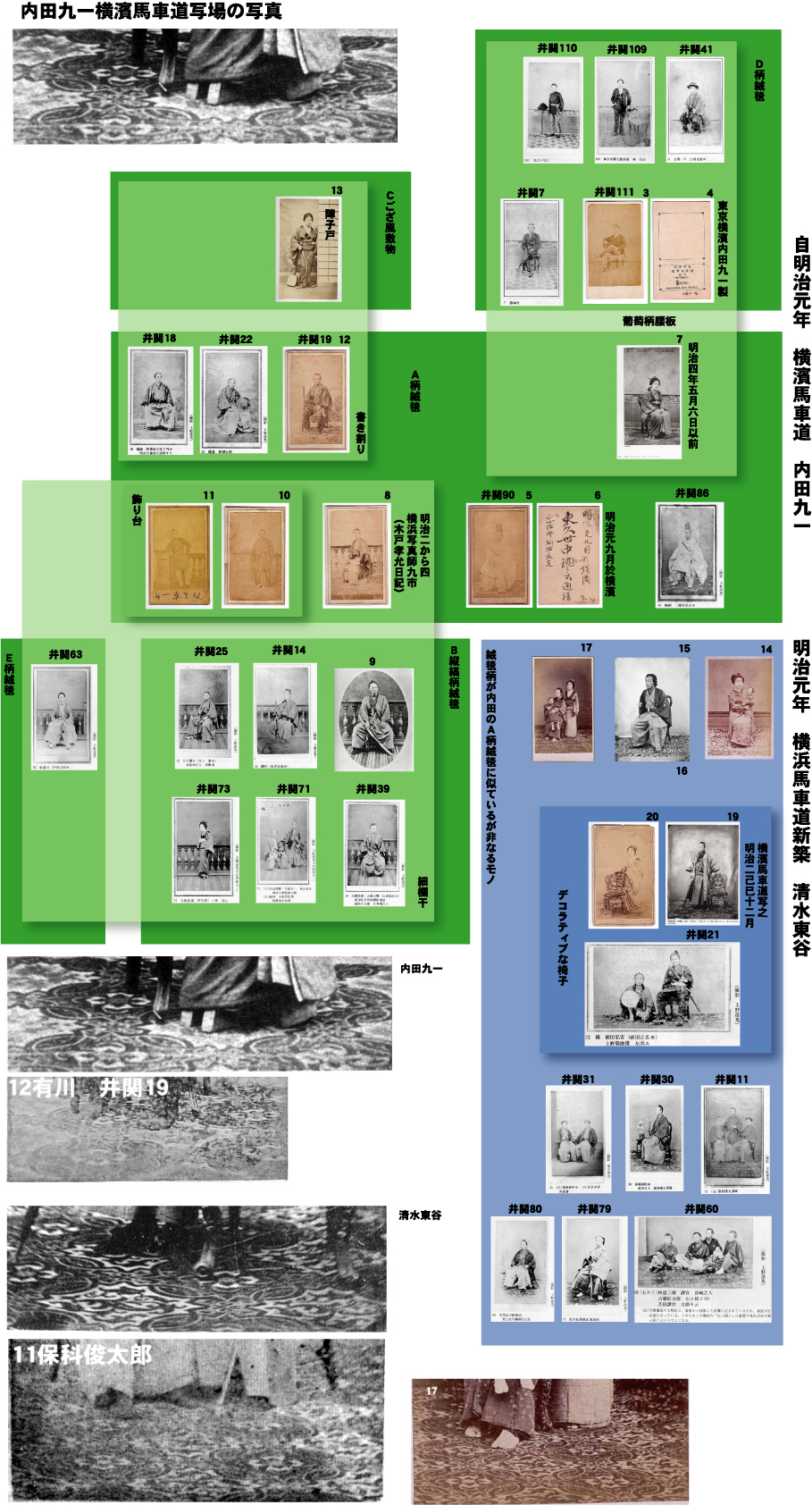 拡大図 HP: 清水東谷と内田九一の似た絨毯の鑑定ポイントをケースバイケースで教えて下さい。 shige: 井関コレクションで例の清水東谷か内田九一か絨毯写真の撮影者が、上野彦馬撮影となっているものがとても多く見られます。 HP: shige+石黒説でゆくと、ほとんどが、清水東谷か内田九一かになってしまいそうですが、上野説の否定根拠も必要ではないでしょうか。 shige: 清水東谷と内田九一の似た絨毯の鑑定ポイントは、見ての通りで、楕円の模様のある黒っぽいところは同じに見えますが、その間の白っぽい部分は不明瞭ではっきりと模様がわからないのでが、特徴です。但し、実際は同じ井関コレクションにある木戸孝允の写真の絨毯が同じものと思われます。 それとこの図の17番の親子の写真(清水東谷)も、よく見るとわかりますが、デコラティブなデザインの椅子の足の部分です。 HP: それにしても、なぜ上野彦馬なんでしょうか。 shige: 井関コレクションの写真鑑定で(小沢健二先生が行ないました)「上野彦馬撮影」とキャプションがあるのは、また、四角い台とか、欄干が背景にあると取り合えず「上野彦馬」となるのは、まだ当時は写真関係の情報も少なかった状況ですから無理もないのですね。 「上野彦馬写真集」を見るとこれも中には上野彦馬撮影ではない写真が混在しています。そのため、小沢健二先生もこの本の再販は不許可にしていると石黒さんから伺いました。 2005年6月 HP: そうですよね。 そうでないと、今度の発表の根拠がなくなりますよね。 Memo 井関60の林道三郎は、神奈川県一等訳官兼権典事林道三郎 | |